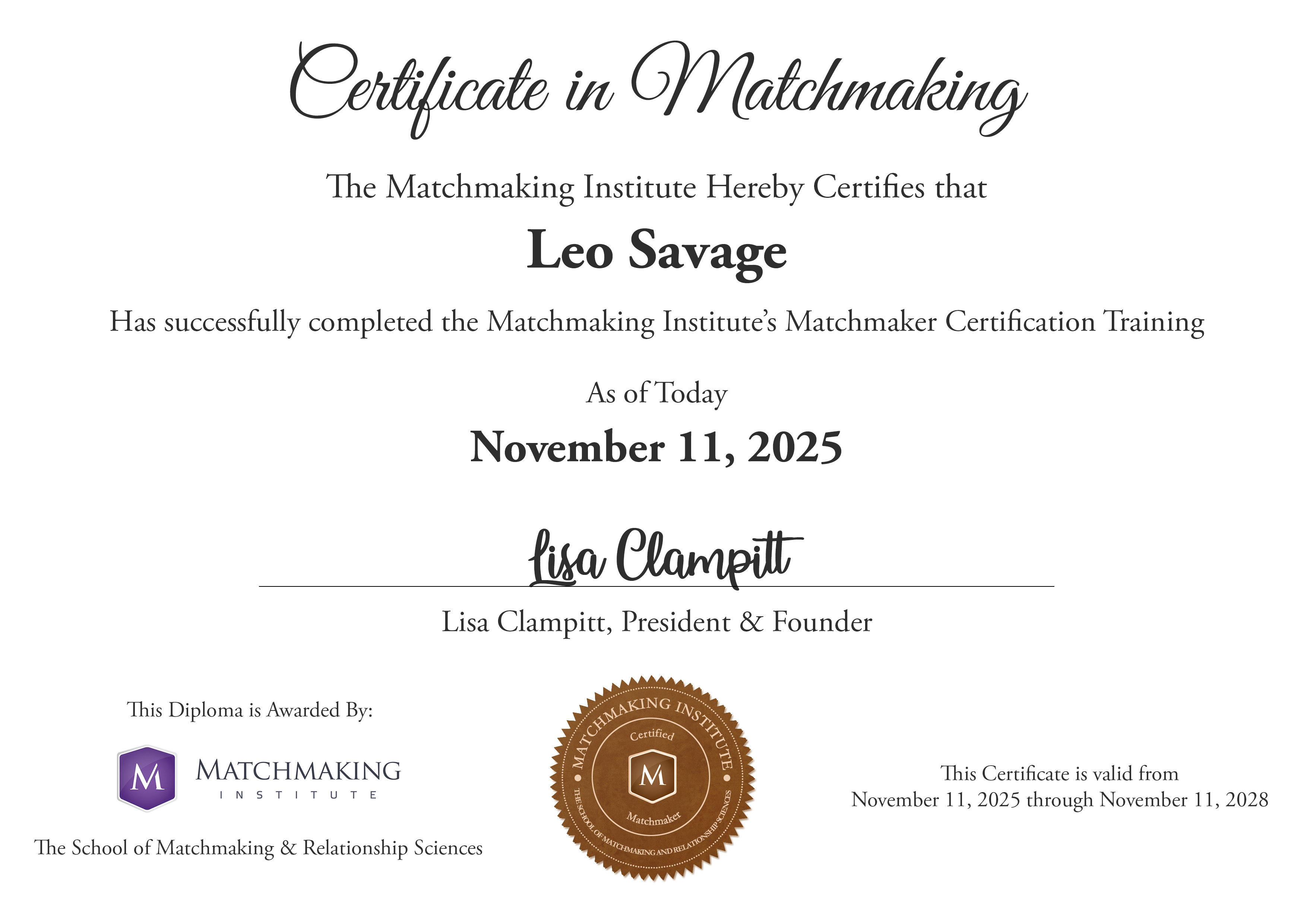 Our team of certified Matchmakers are carefully selected and undergo rigorous, ongoing training to ensure they bring not only expertise, but also empathy, discretion, and insight to every client relationship. We are proudly certified by the Matchmaking Institute and dedicated to providing an exceptional level of personal service, taking the time to truly understand each client’s lifestyle, preferences, and long-term goals. Every introduction is made with intention and care, designed to align with your unique vision of an ideal partner.